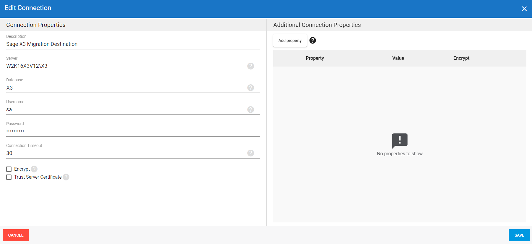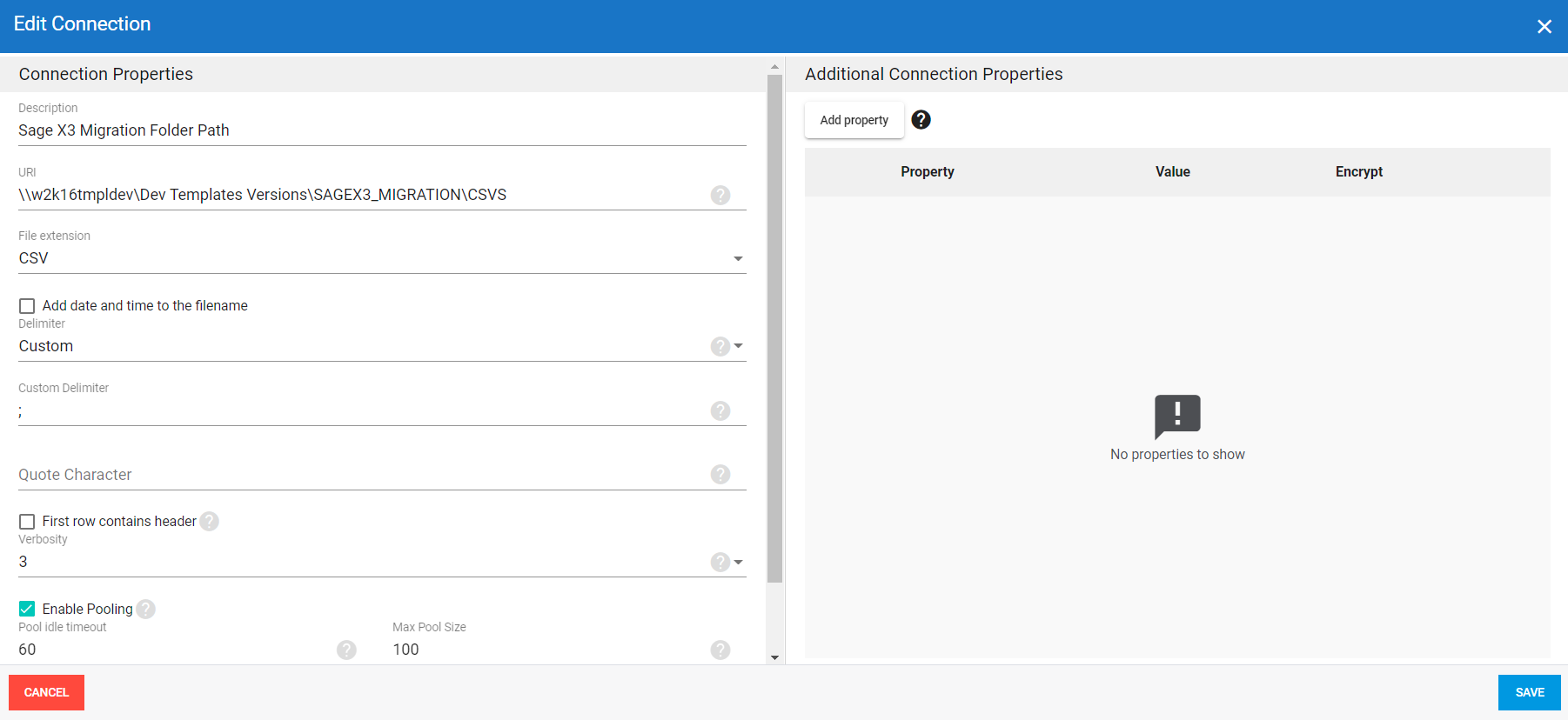 You need to create three destination connections for data migration to Sage X3 in DataSync (see Adding a Source and Destination Connection for details).