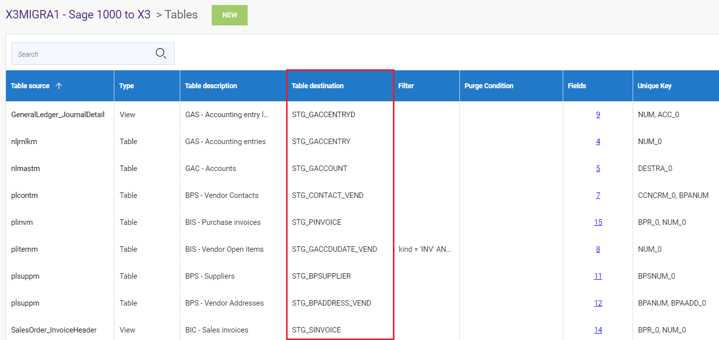 After creating the extractions, you should see the staging tables in each extraction. They are displayed in the Table Destination column and start with STG.