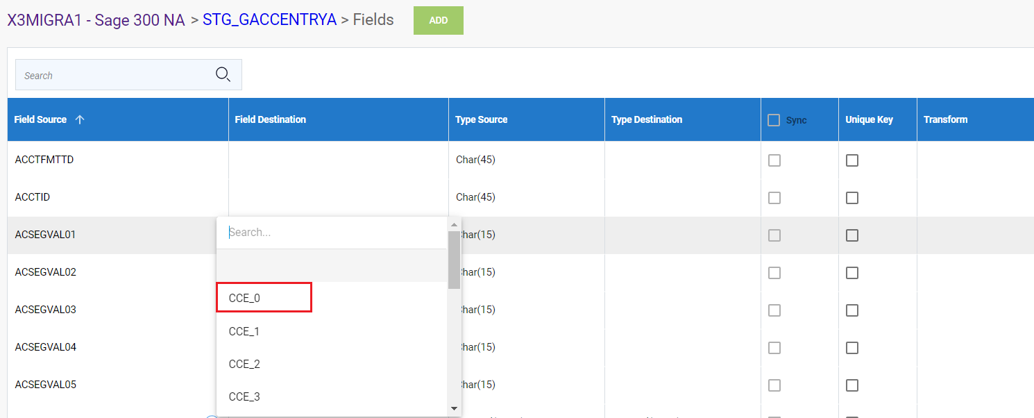 Open Extraction 1 (X3MIGRA1) and navigate to STG_GACCENTRYA > Fields.