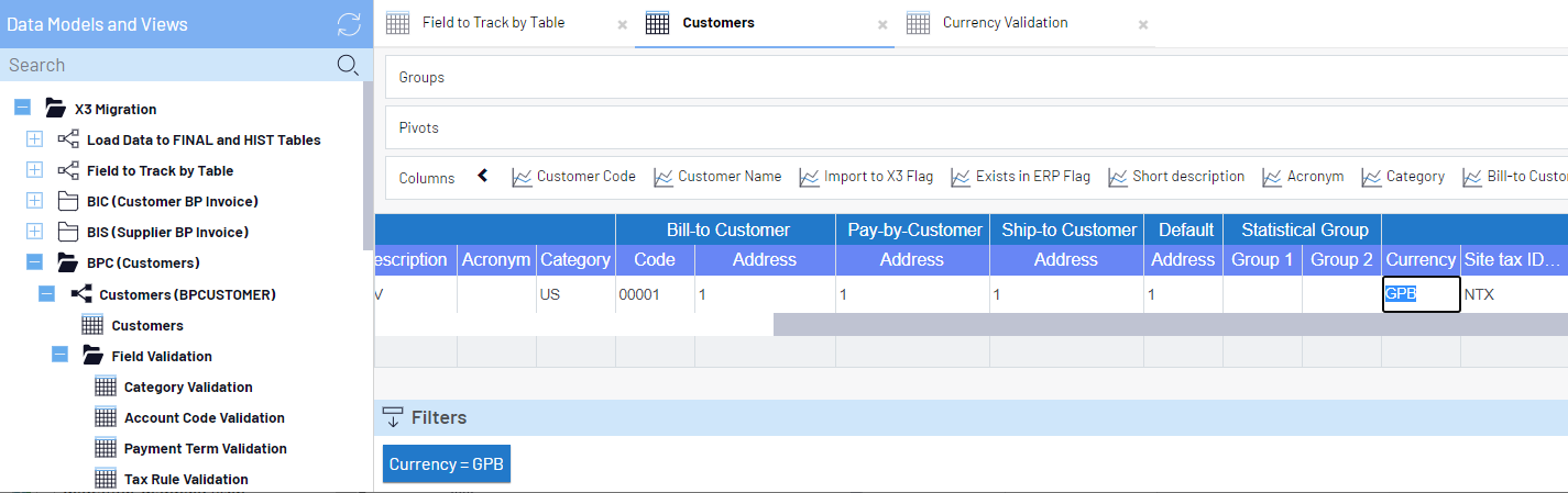 In the example below, we opened the Currency Validation worksheet under the Customers template.