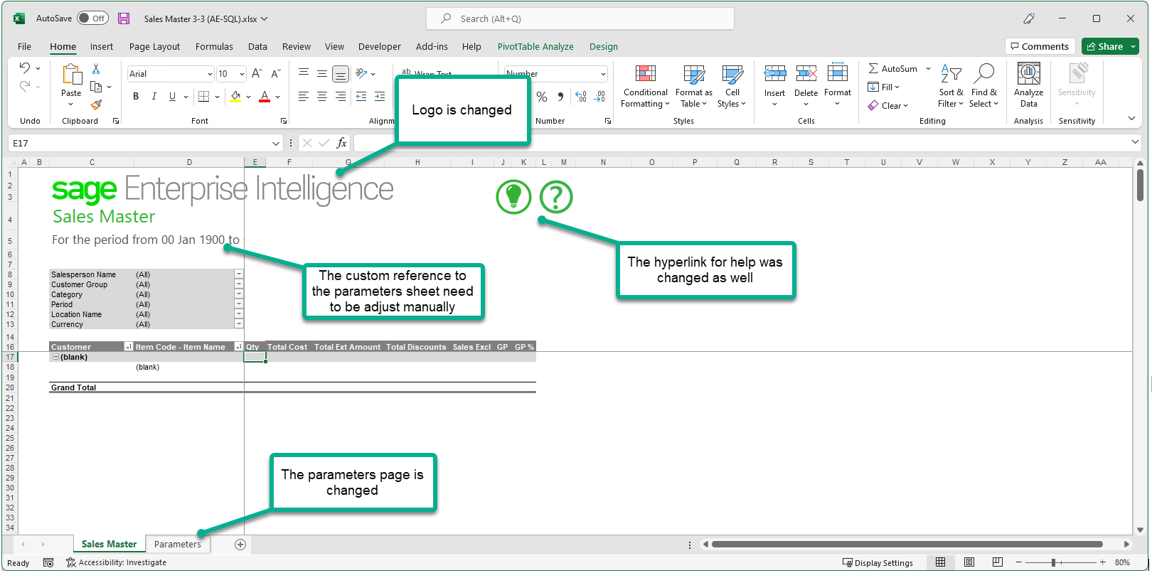 You may have to manually change some formulas if you were doing VLookup or simple cell references to the Parameters sheet in the SI report. The Parameters sheet is not structured exactly the same way in SEI, so you may have to change the formulas to point to the proper cell. This step is optional and not all reports use such formulas.
