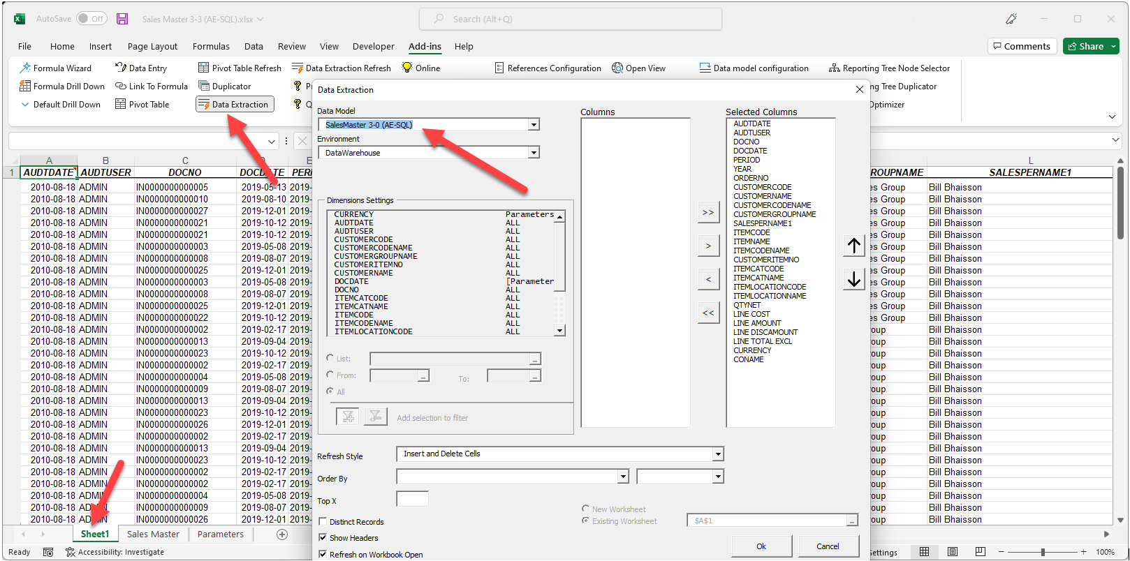 The Sales Master 3-3 (AE-SQL) report is part of the Sage 300 demo reports. This report was created in Sage Intelligence with a simple container with a data dump and a few filters are required to run the reports.