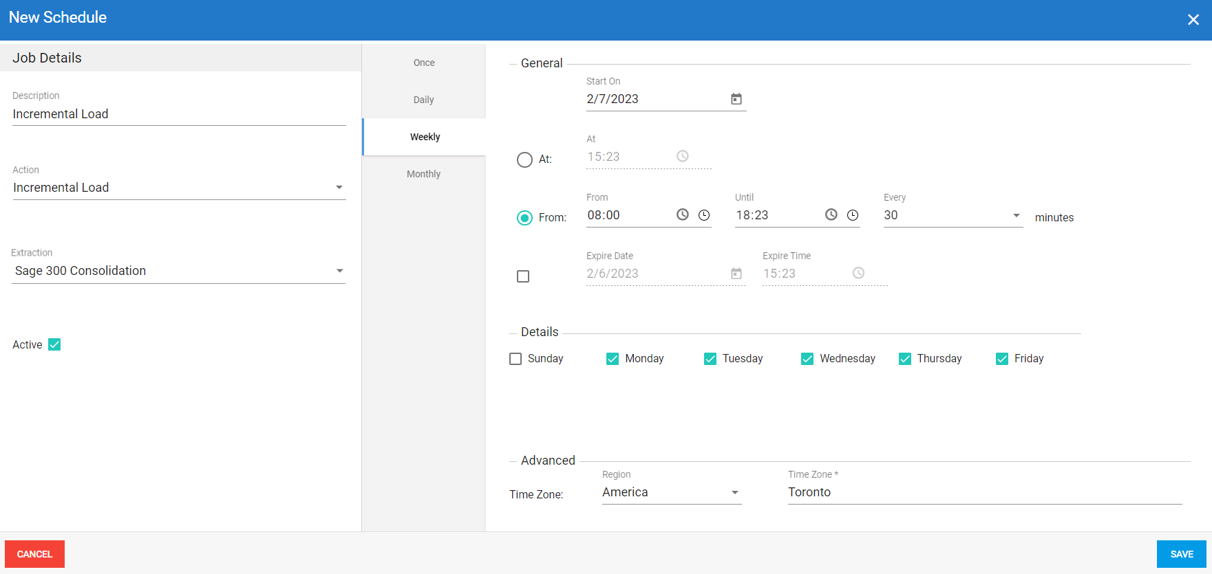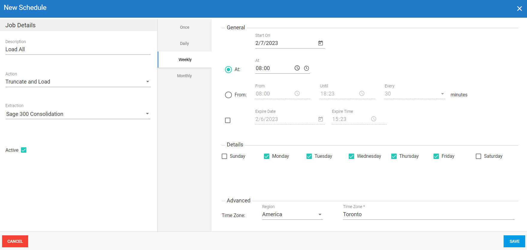 After configuring the Sage 300 extractions, you can create job schedules so that the tables are automatically refreshed on a regular basis.