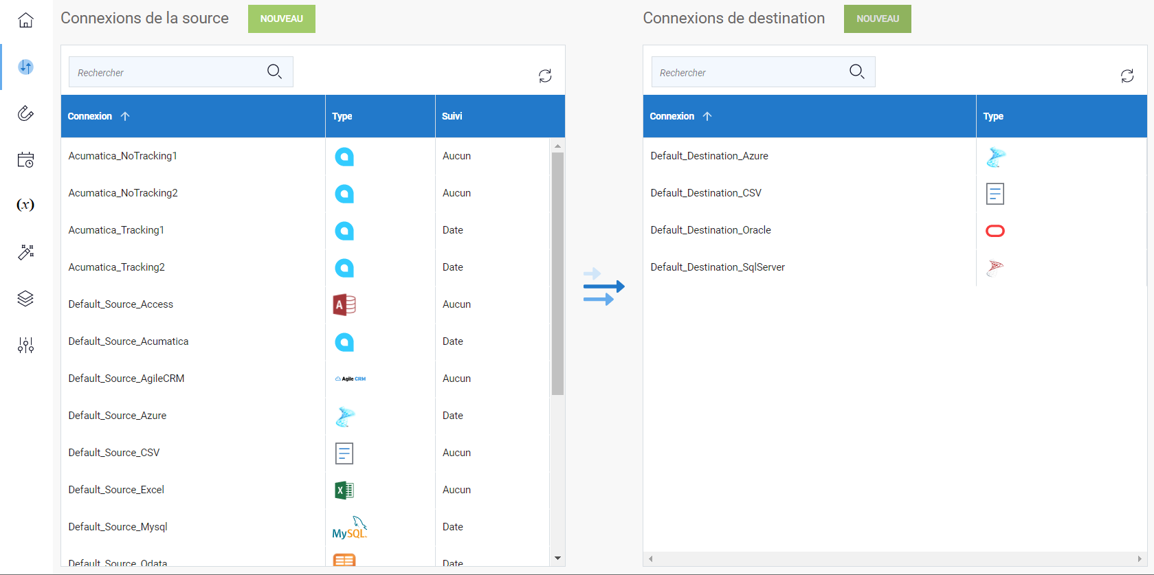 Pour extraire vos données, vous devez ajouter une connexion source et une connexion destination.