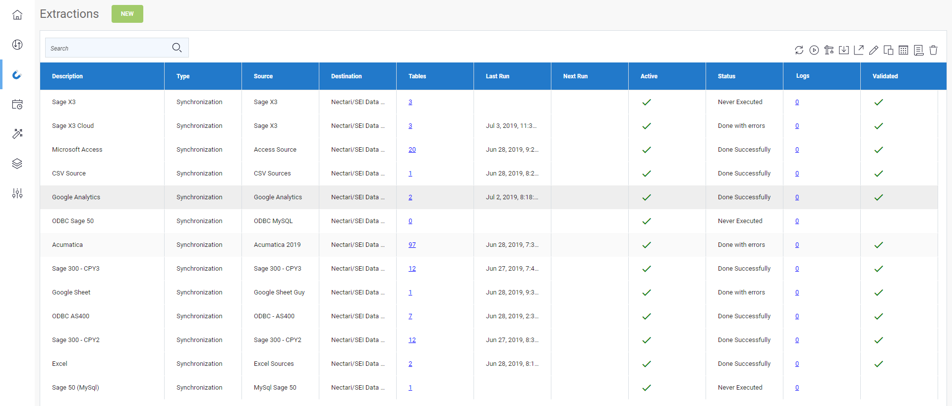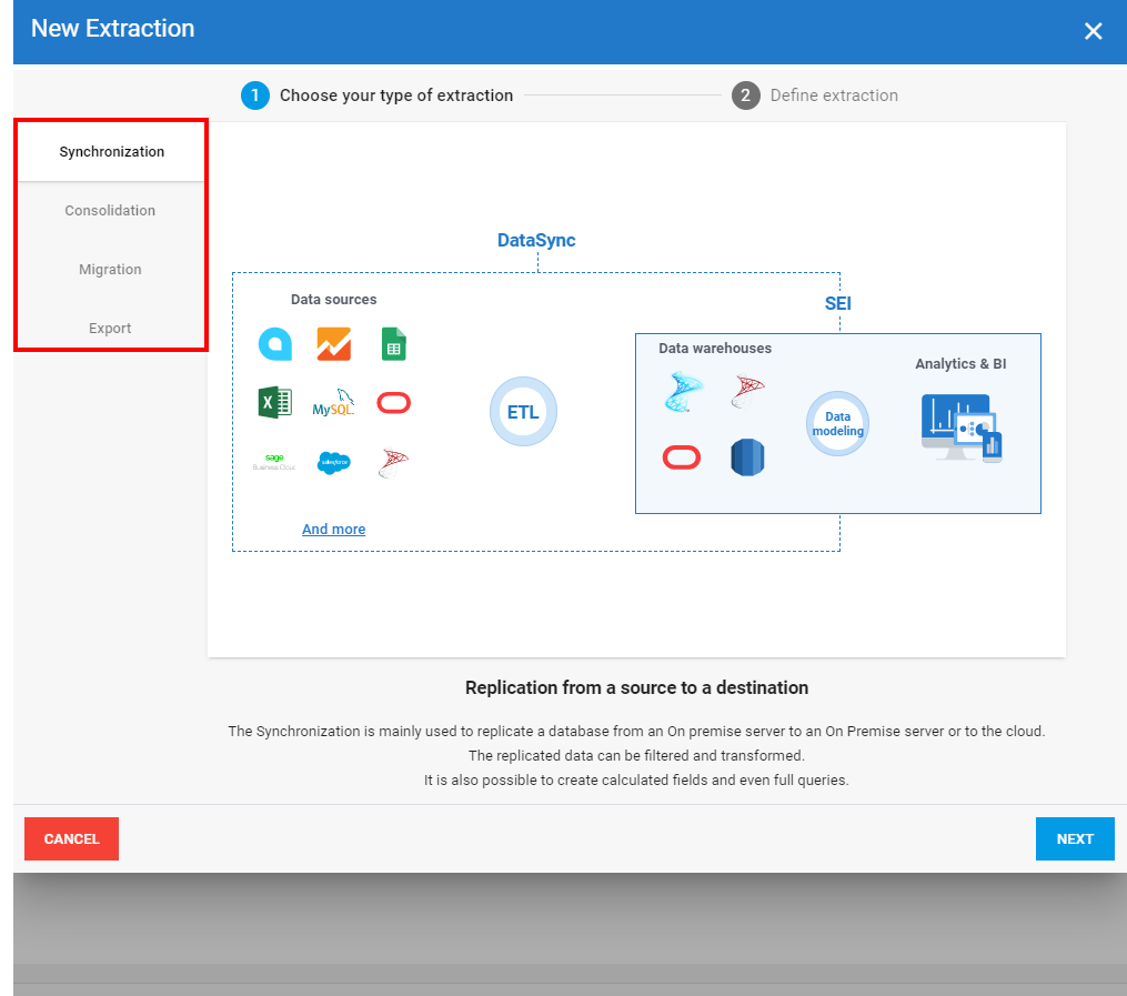 - Synchronisation : consiste à répliquer des tables d'une connexion source vers les tables d'une connexion destination.
