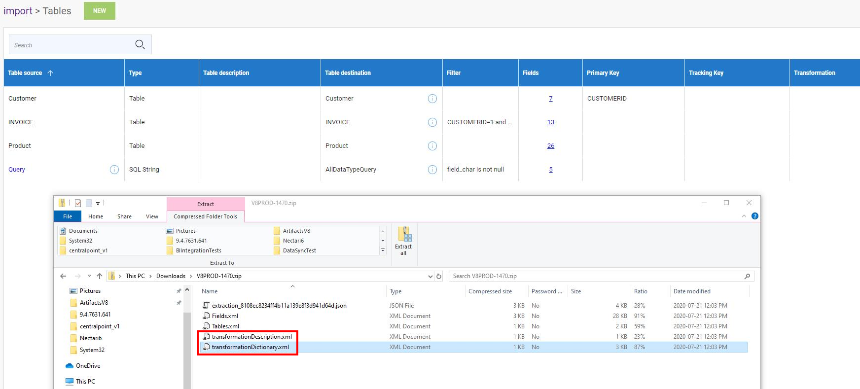 Si l'Extraction contient des Transformations, elles seront également incluses dans le fichier .zip lors de l'importation (voir Importer une extraction pour plus de détails).