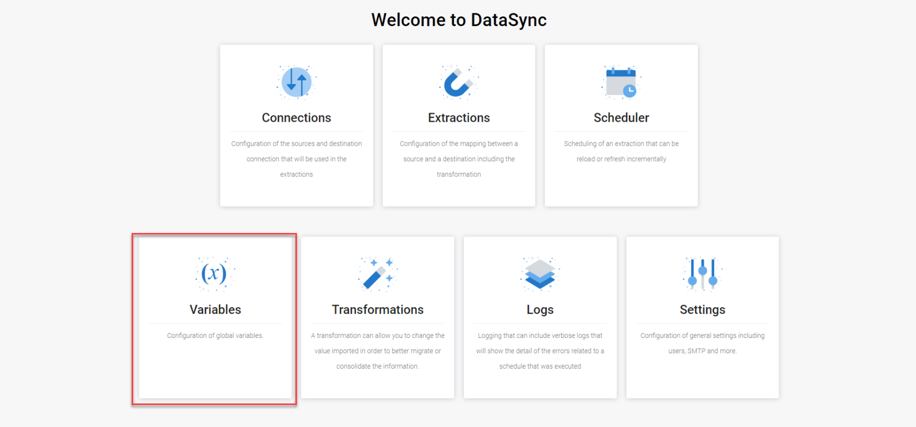 Vous pouvez également accéder à la page des Variables depuis n'importe quel endroit de l'interface DataSync en cliquant sur l'icône Variables dans le menu latéral de gauche (voir ci-dessous).