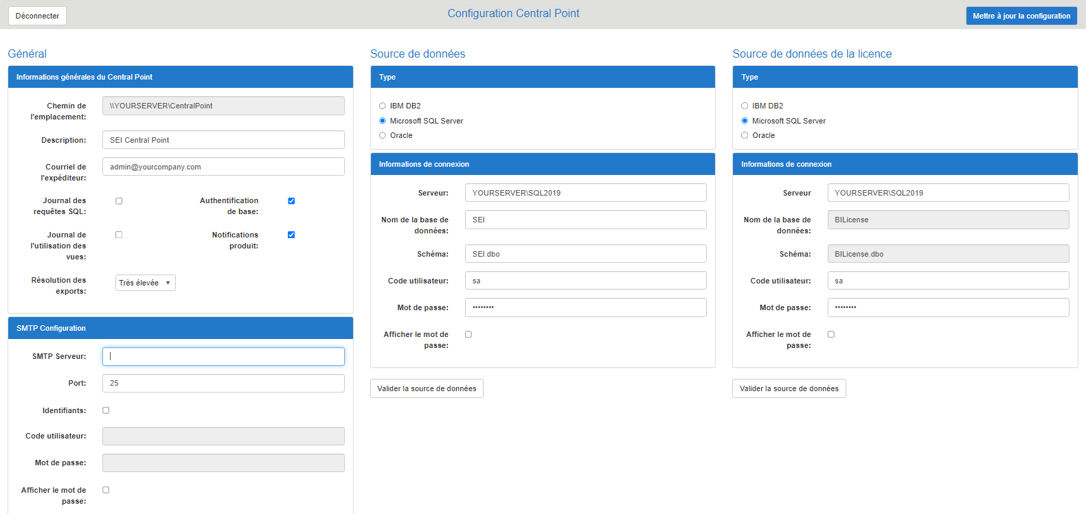 Source de données Deux sources de données sont requises pour le Central Point: la base de données de configuration (installée avec le paquet SEICentral Point for SQL Server and Oracle) et la base de données des licences (installée avec le paquet SEI License Server). Le nom de la base de données des licences est invariablement BILicense. |
