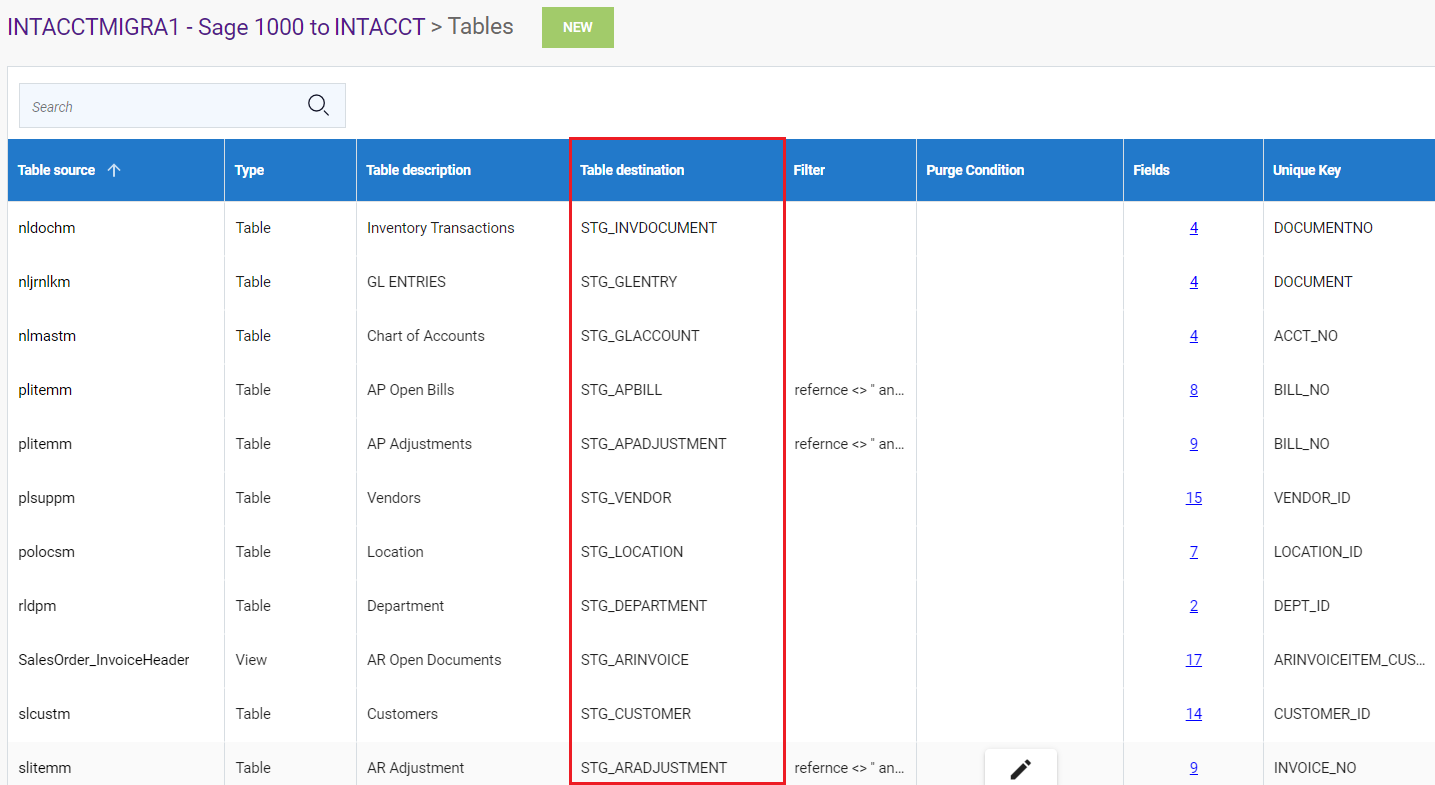 Après avoir créé les extractions, vous devriez voir les tables de staging dans chaque extraction. Elles sont affichées dans la colonne Destination de la table et commencent par STG.
