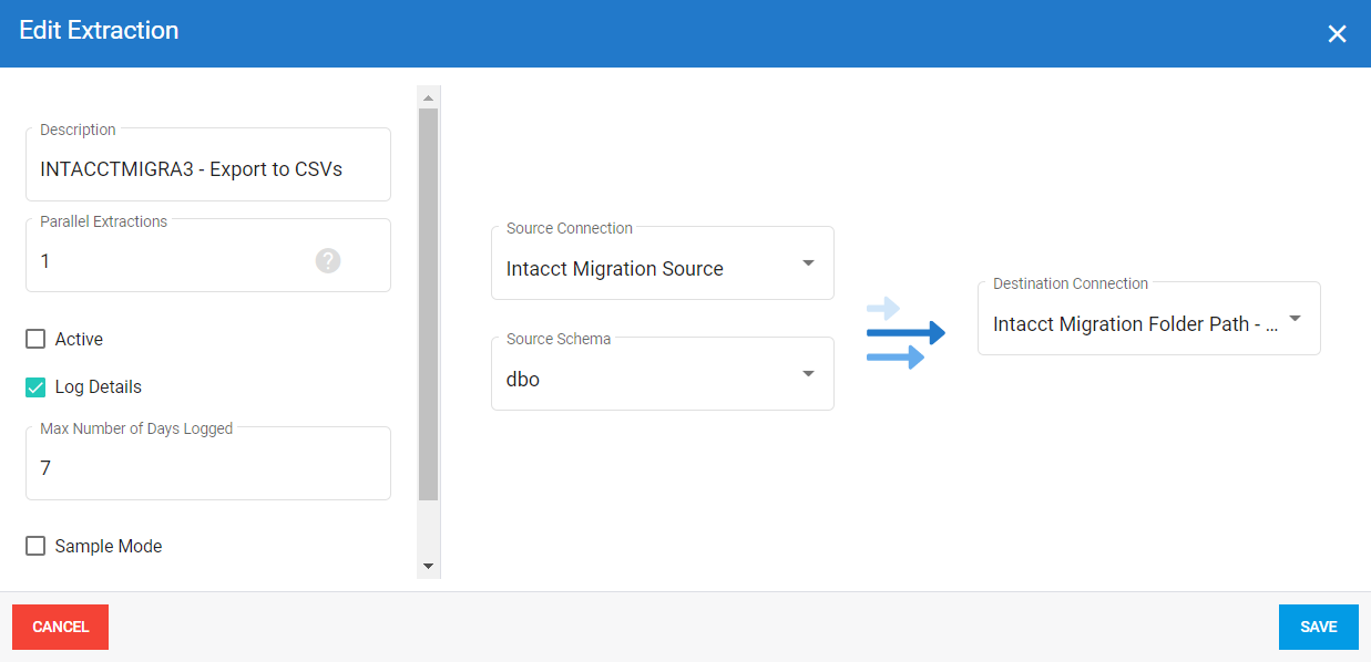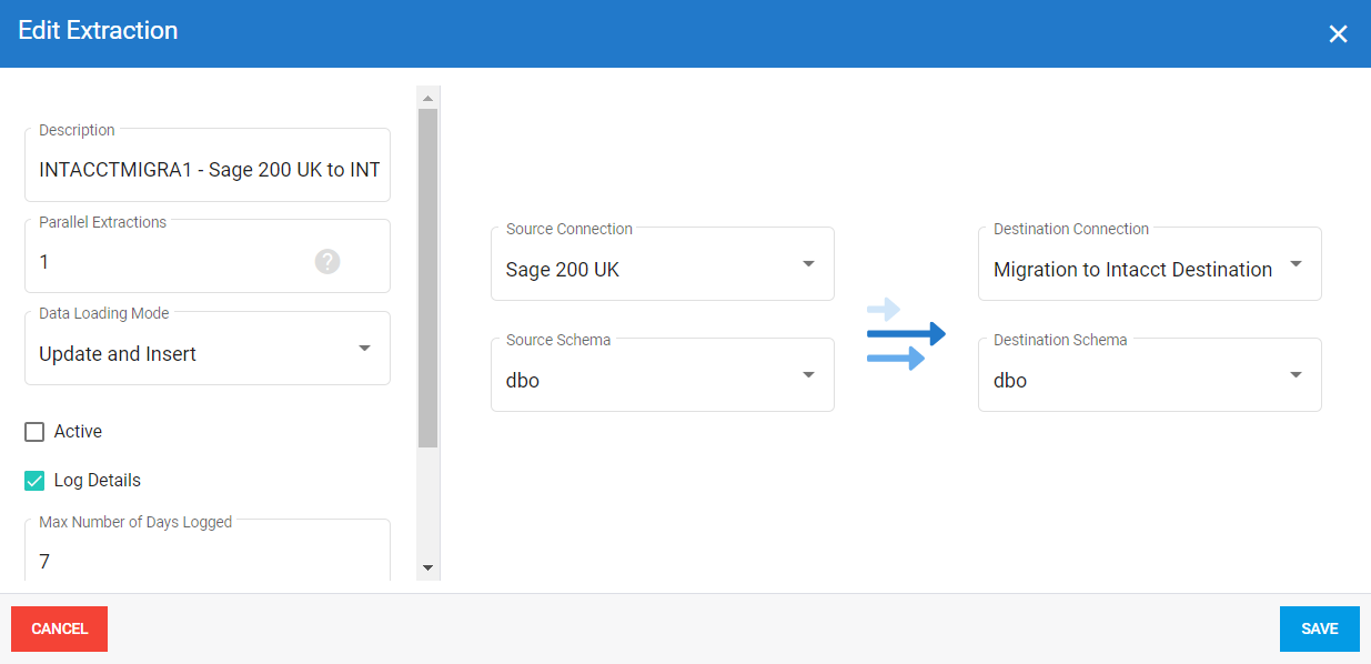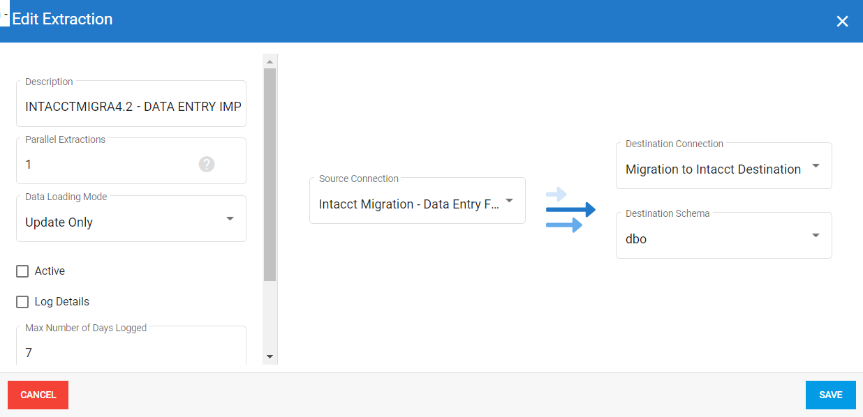 1. Importez l' extraction en sélectionnant le type d'extraction Synchronisation tel que décrit dans Ajouter une extraction. Utilisez votre base de données Sage Intacct comme source et votre base de données de migration comme destination.