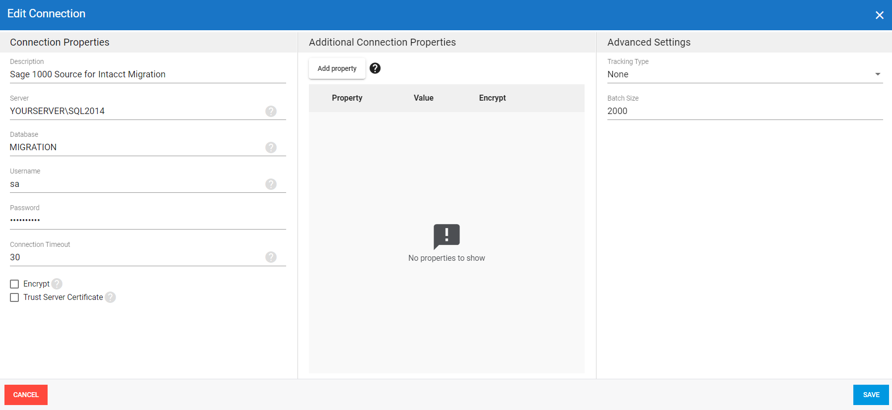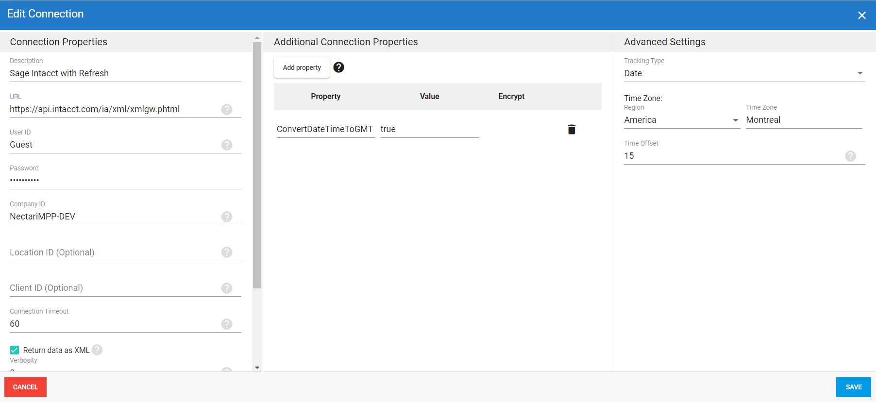 Vous devez créer quatre connexions sources pour la migration des données vers Sage Intacct dans DataSync (voir Ajouter une connexion source et une connexion de destination pour plus de détails).