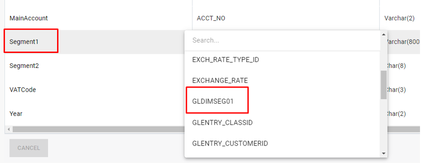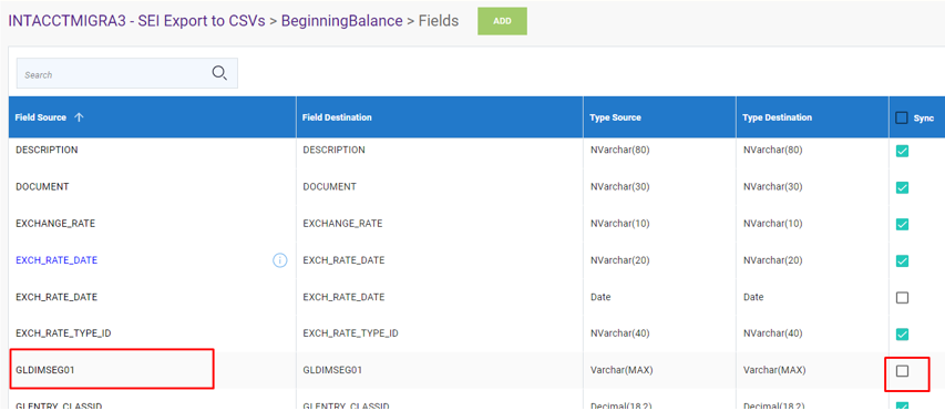 Dans DataSync, ouvrez l'extraction 1 (INTACCTMIGRA1) et naviguez vers STG GLENTRY > Champs. La nouvelle dimension est maintenant disponible comme source de mappage. Sélectionnez la dimension dans la liste.