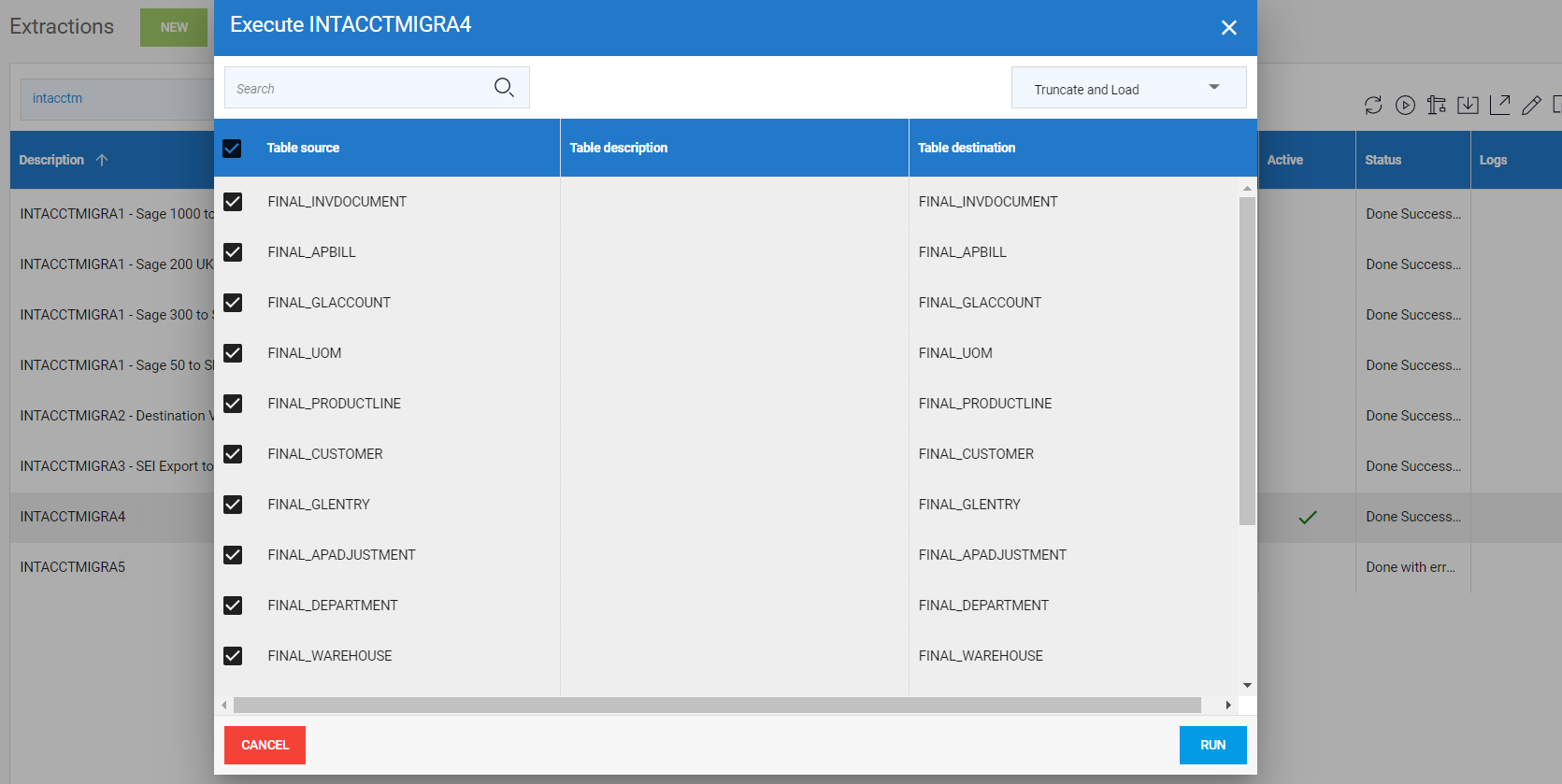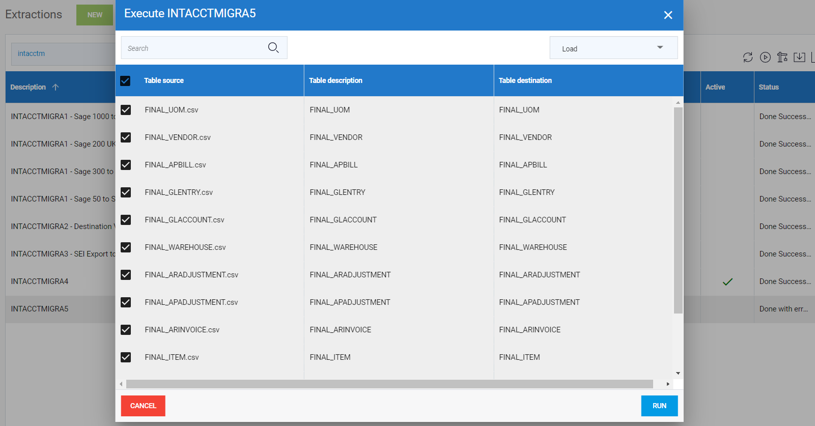3. Dans DataSync, exécutez l'extraction 5 pour importer le CSV et mettre à jour les tables finales.