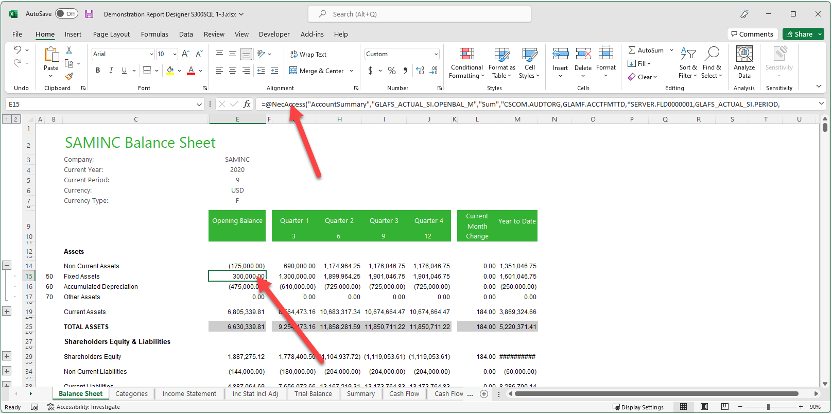 The Demonstration Report Designer S300SQL 1-3 report includes a few formulas that are different from Sage 300 as well as reporting trees.