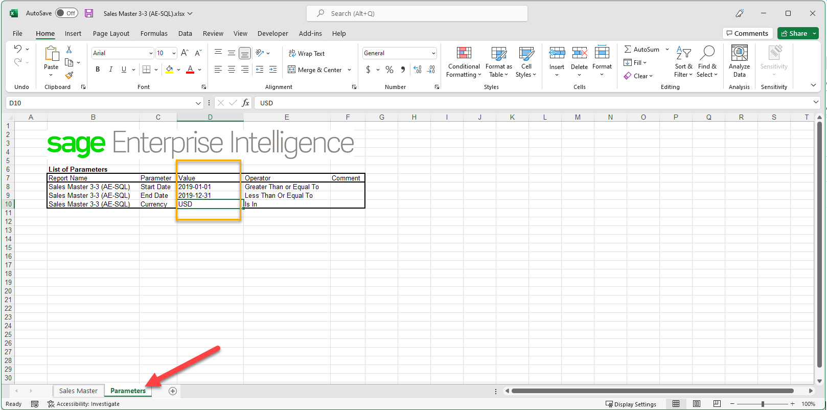Click the Parameters sheet and enter the values in the filter area.