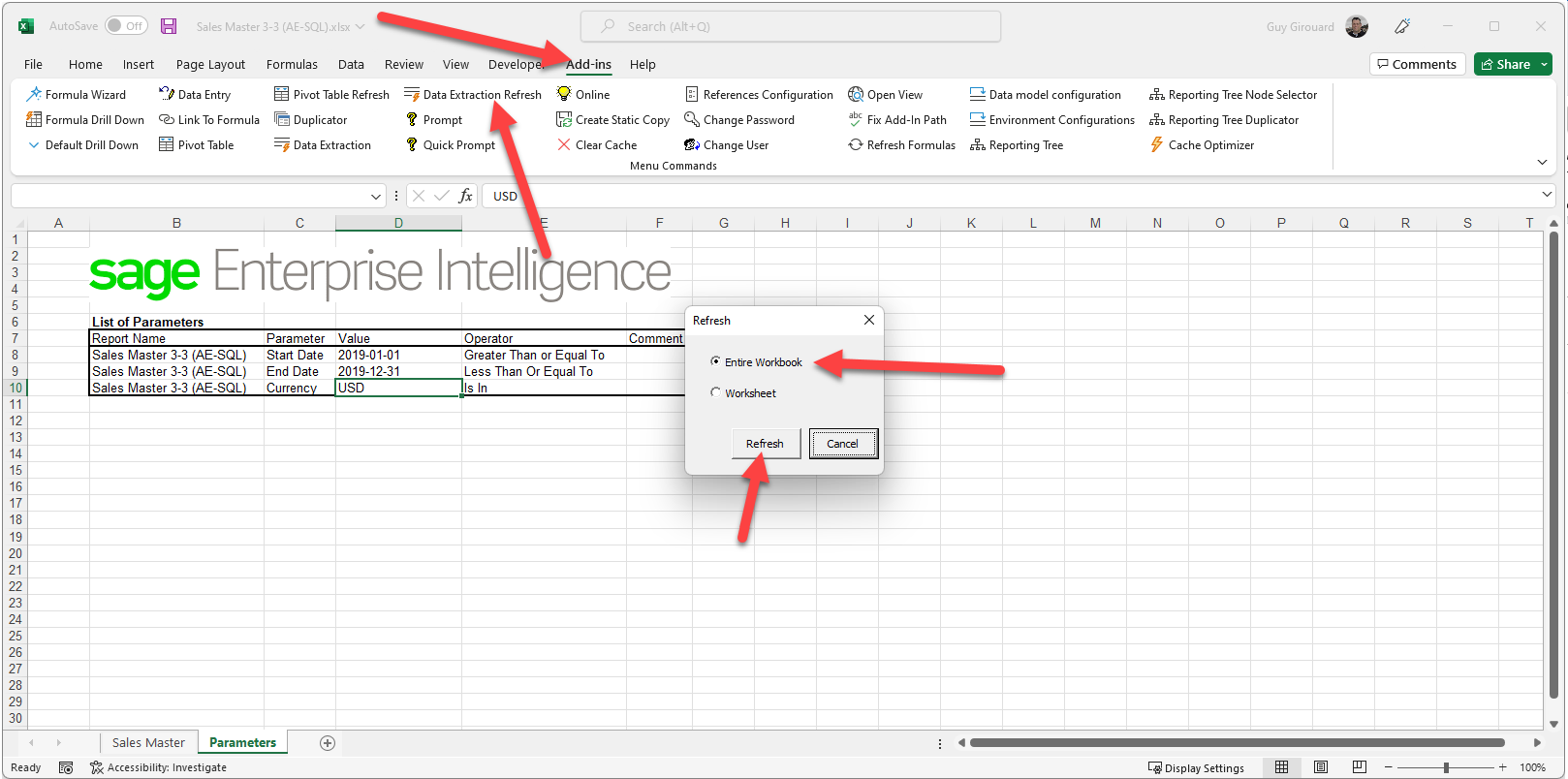 Before running any data extraction refresh, you need to put values in the Parameters sheet for the different filters and parameters.