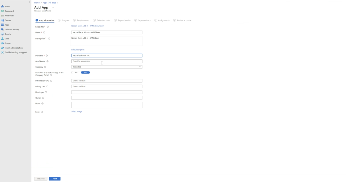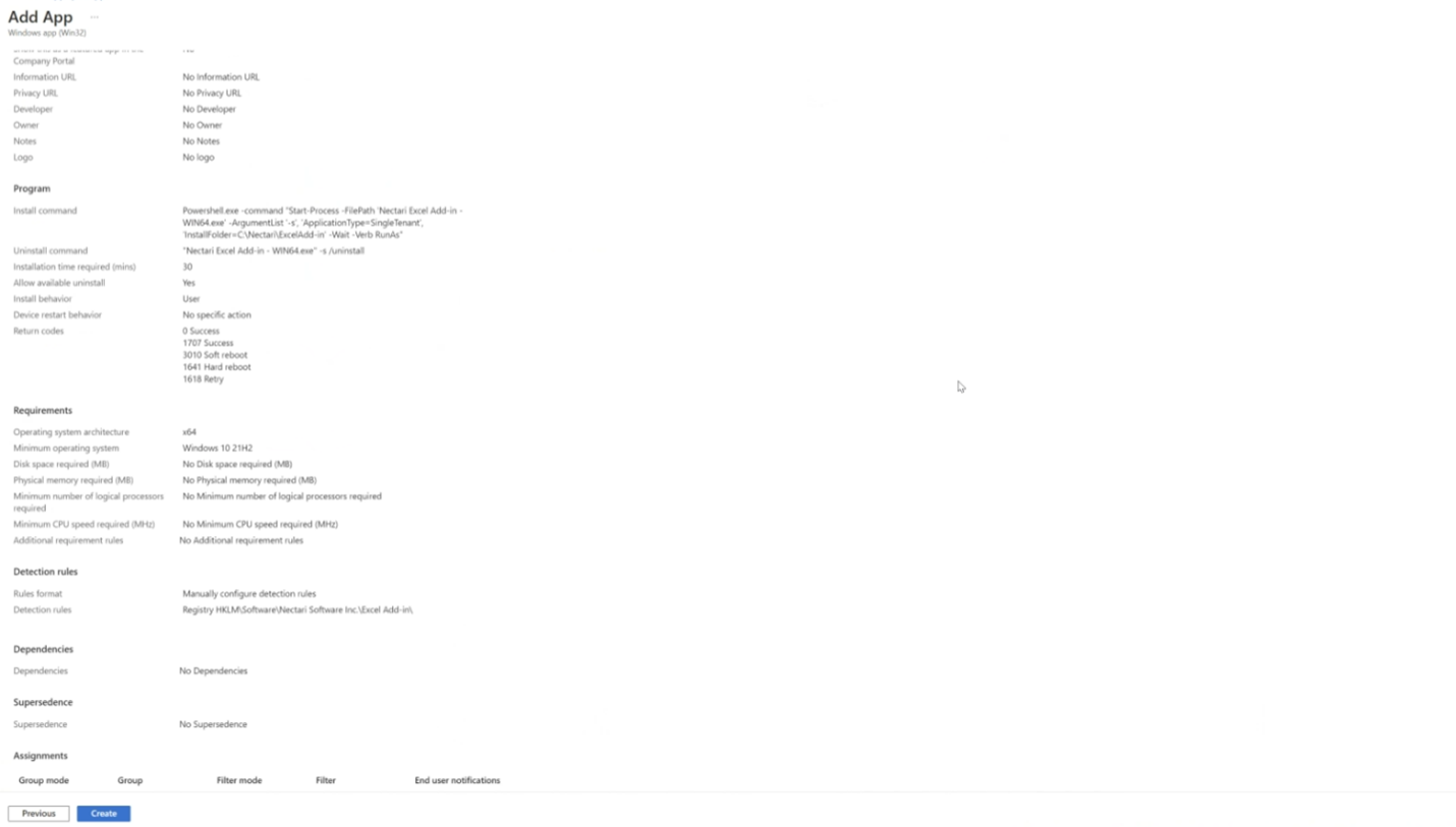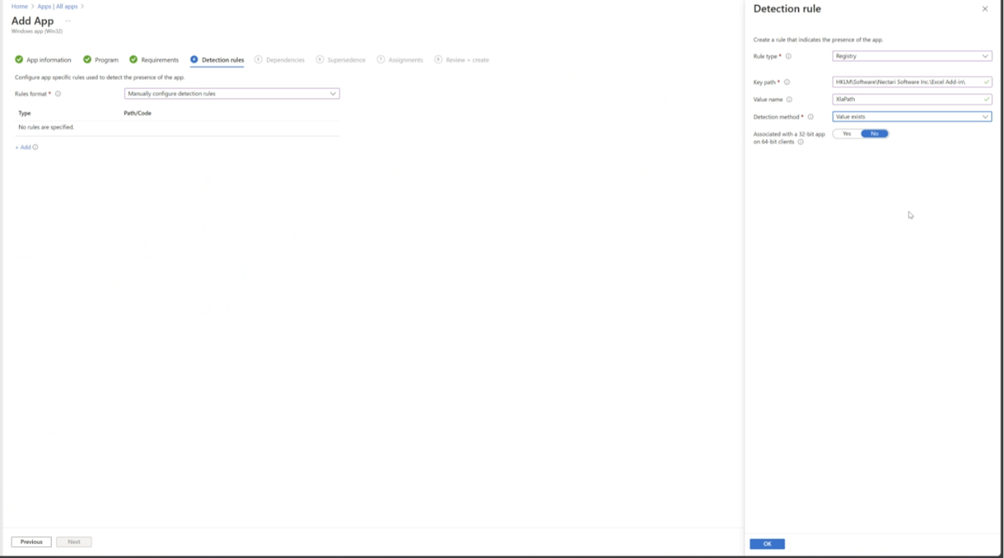 Key path: Enter the path to the registry key that Intune should check to confirm the app's presence. The path is: HKLM\Software\Nectari Software Inc.\Excel Add-in
