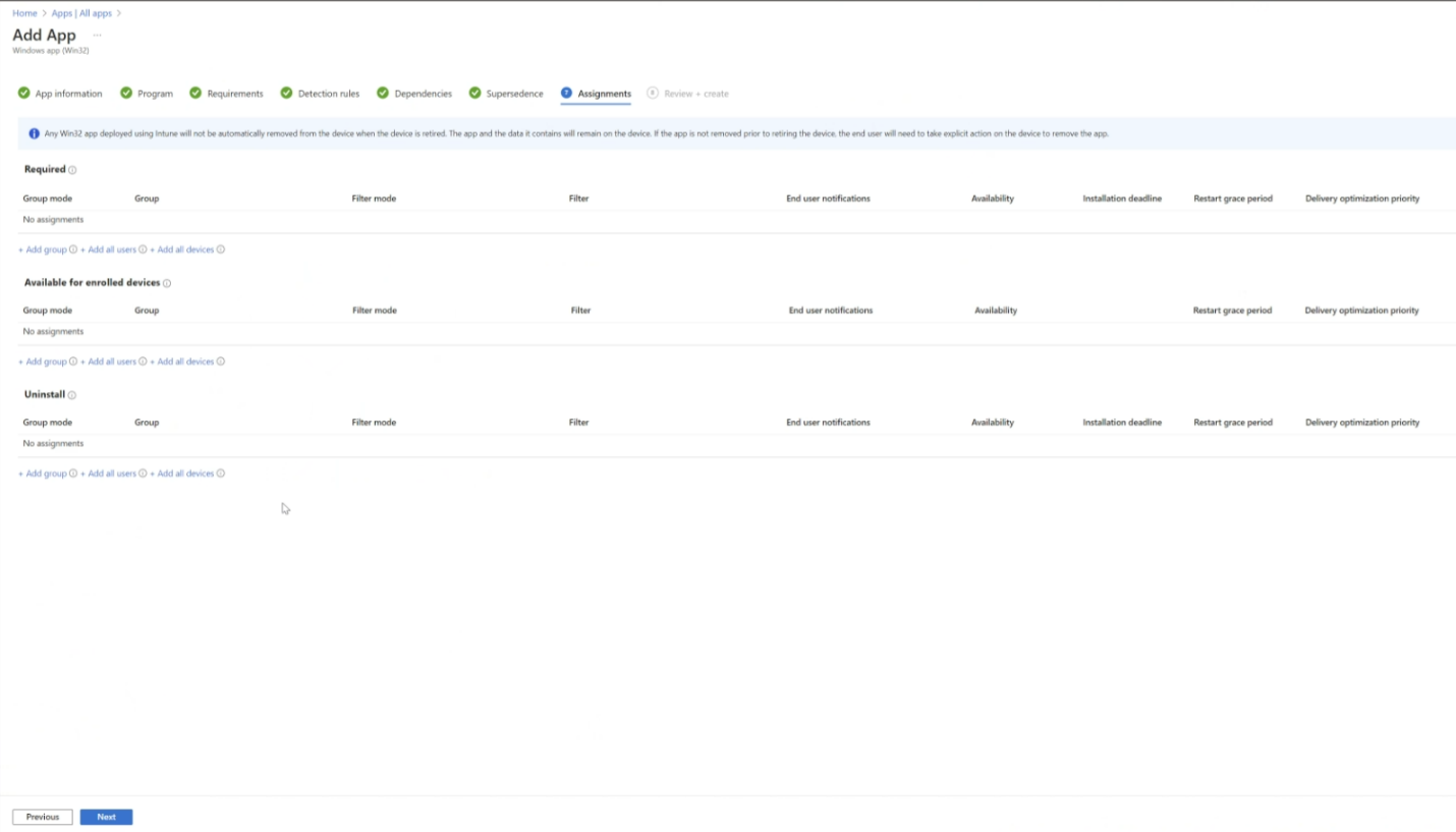 Detection rules: This area is where you specify how Intune should detect whether the app is already installed on a device. This ensures that Intune does not attempt to install an application on a device where it is already present.