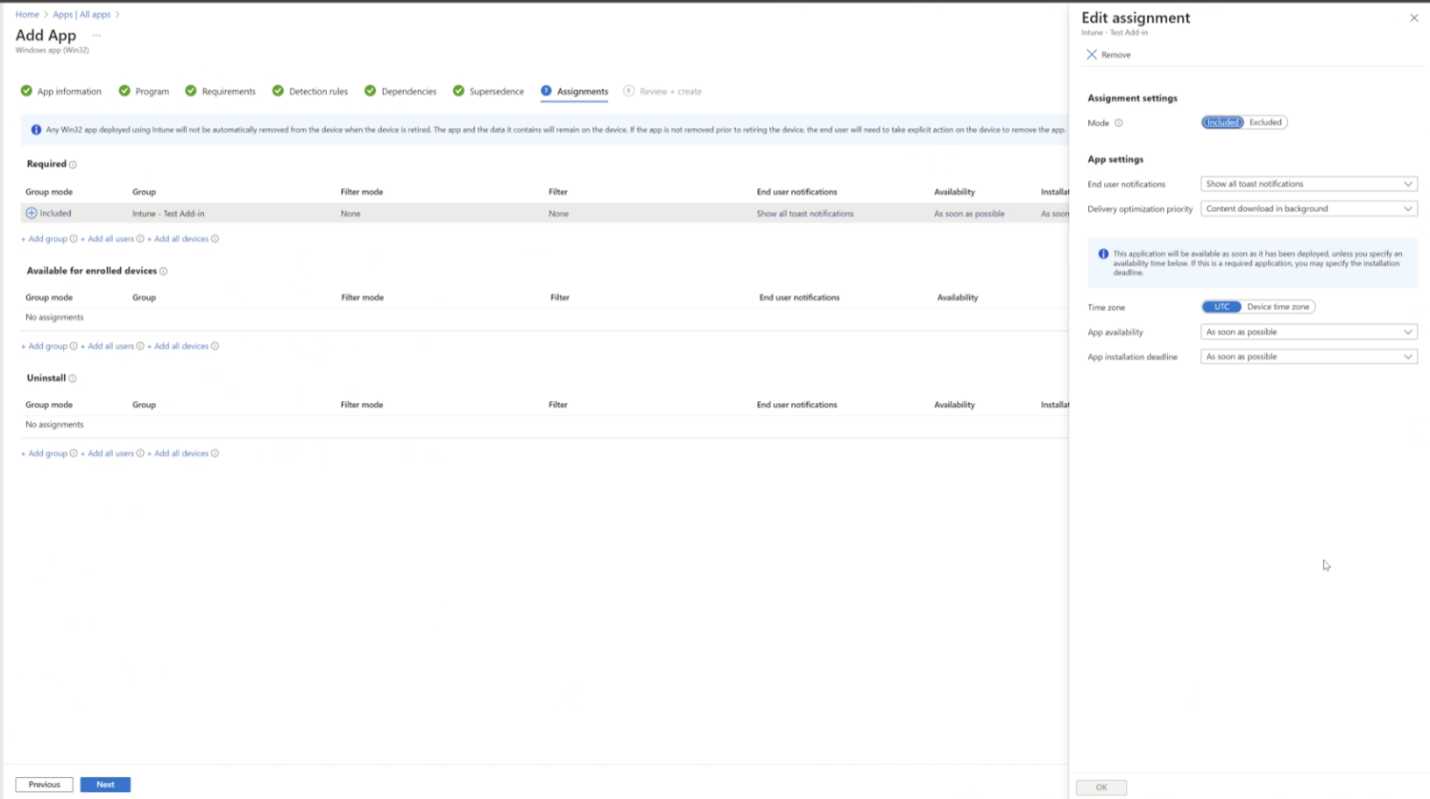 Upon the creation of SEI Excel Add-in application in Intune, it is important to set the expectation that there might be a significant delay before the application is fully installed on the employees' devices. This latency can be attributed to various factors such as network bandwidth, device availability, and the inherent processing time required by Intune to distribute the application across multiple endpoints.