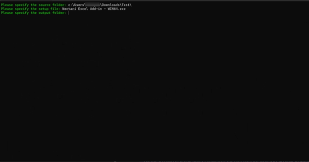 Specify the setup file, in this case SEI Excel Add-in – X64.exe, then the output folder. (The output folder can be the same as the source folder.)