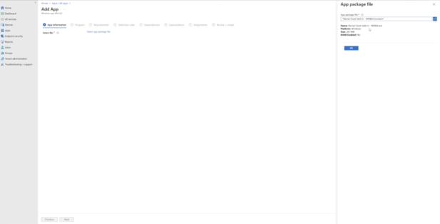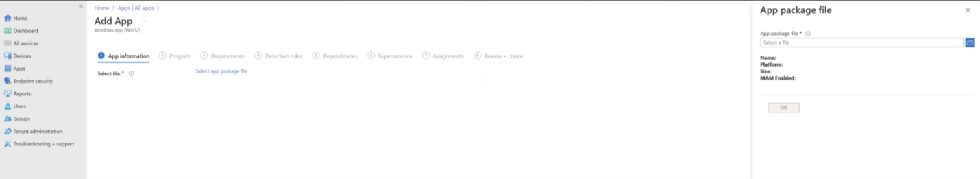 Click Select app package file and browse to the .intunewinfile created beforehand.
