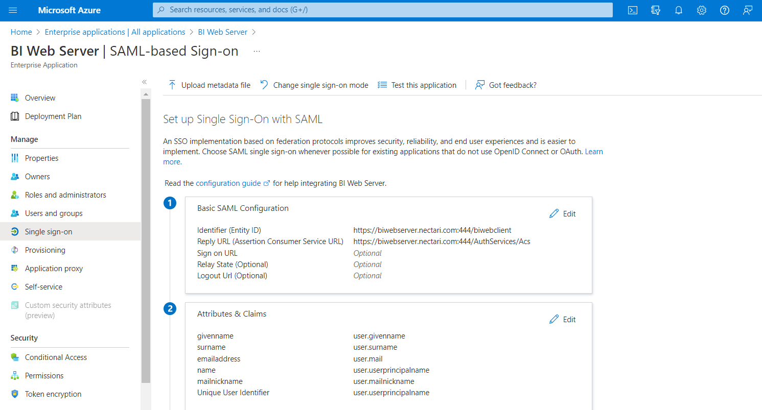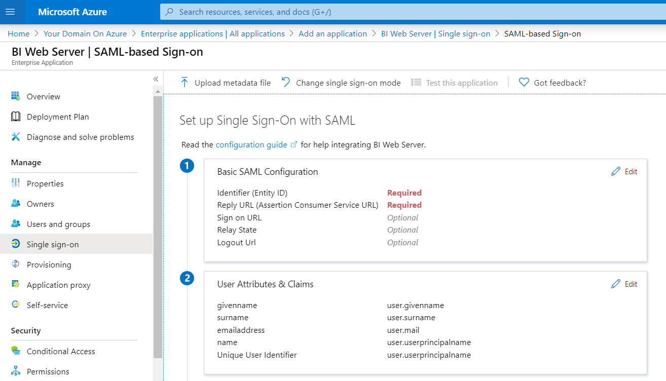 In this example we have biwebserver.mycompany.com as the URL address with port :444 and biwebserver as Unique Identifier for the Azure Domain.