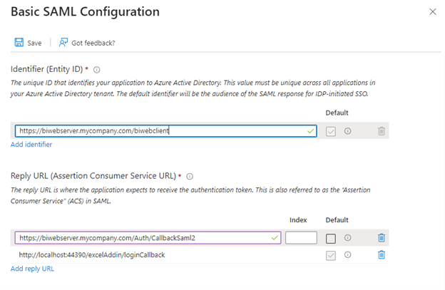 In the Reply URL (Assertion Consumer Service URL) field, copy the URLs from the Saml2 ACS URL parameter in the Web Server for both Web Server and the Excel Addin.