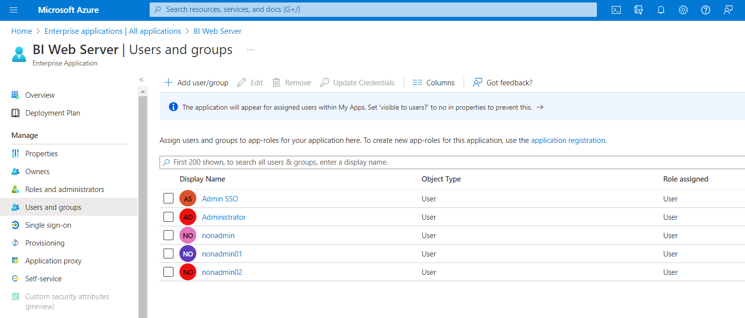 In the upper bar, click + Add user/group to authorize users and groups to use SSO. This completes the basic SAML configuration.