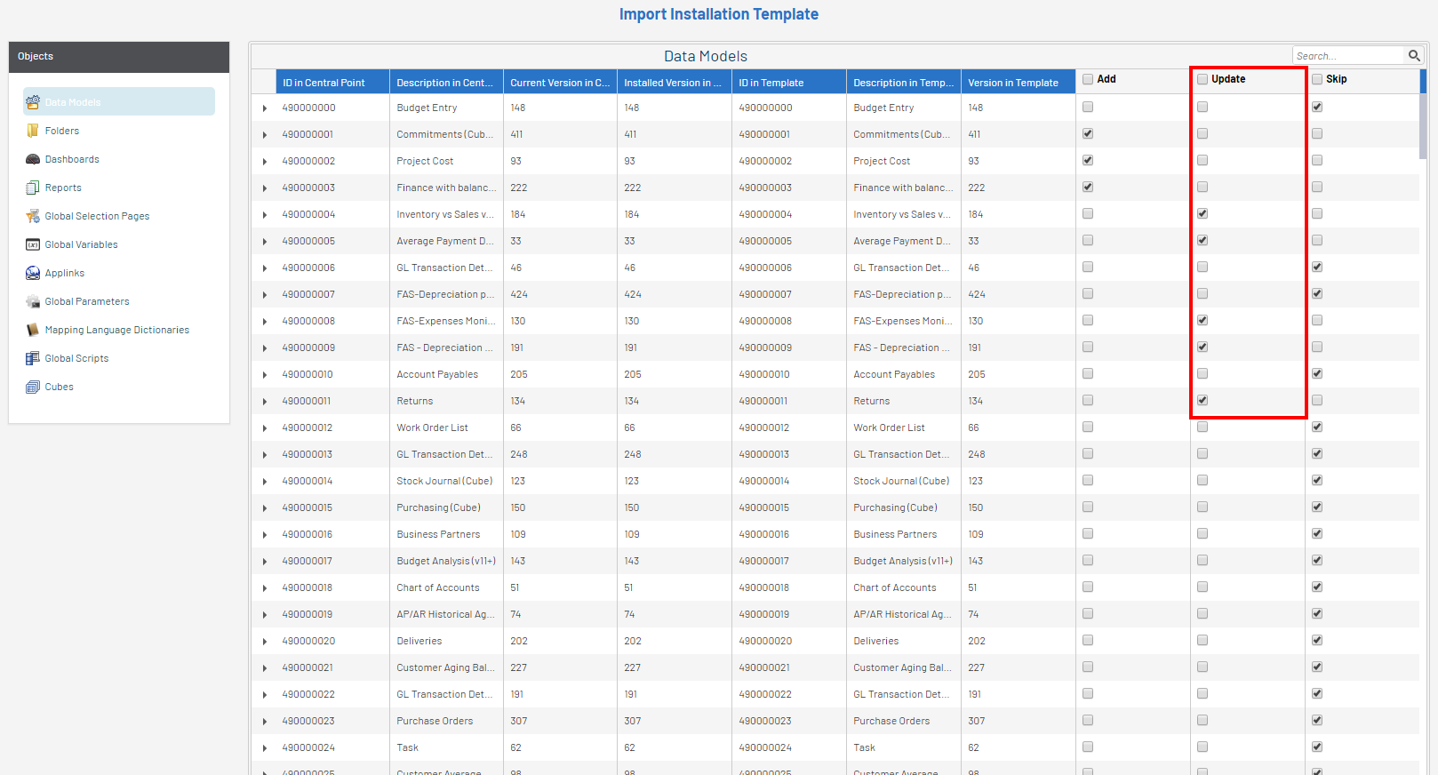 By default, no option in the Update column will be selected. If there is a new data models or view, the Add option will be selected. Select Skip if you want to ignore it.