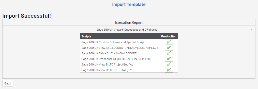 After importing, an execution report will be produced. The first section is for the ERP data source and the one below it is for the Cube data source.