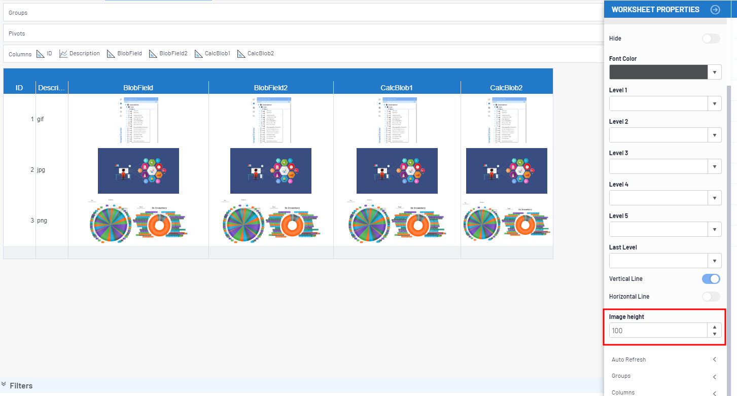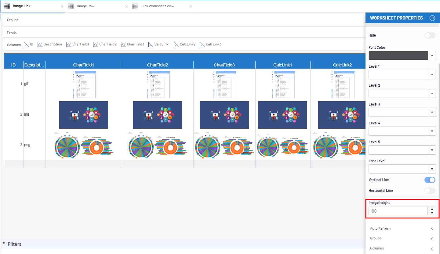 5. Add the Image (RAW) fields and set up the Image Height in the Worksheet Properties ( click on to get access).