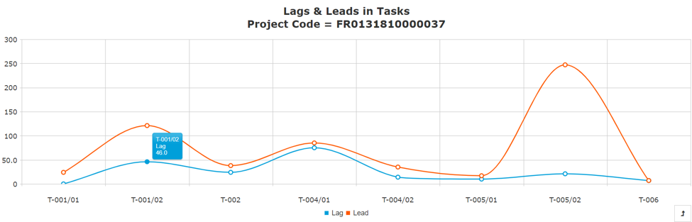 Lags and Leads can also be very useful in understanding the pattern of activities over time which can further help us in scheduling activities and further optimize them. The graph below shows the lags and leads calculated based on the start and end dates of different tasks involved in a project. There is a lag of 46 days between tasks T-001/02 and T-002.
