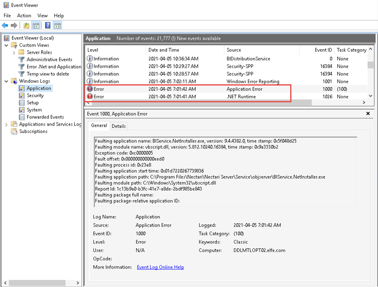 The Event Viewer is available on all Windows installations. You can use it to identify issues such as frequent restarts of the BI Service, Job Service and BI Distribution application or rare cases of unhandled exceptions. You can also track down problems with Windows components that are used by SEI.