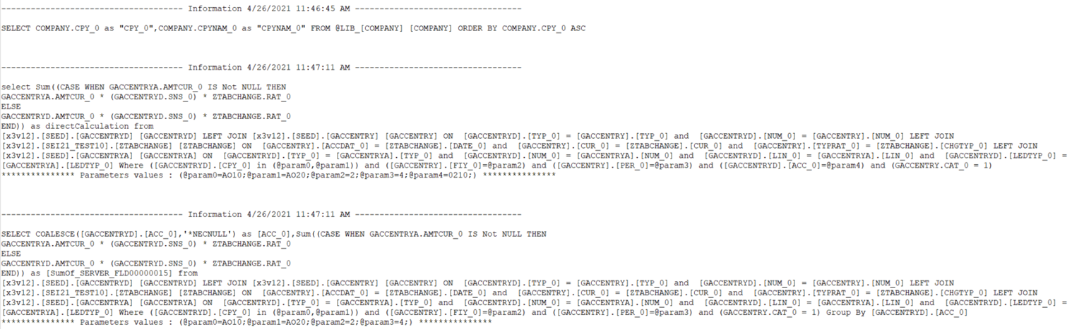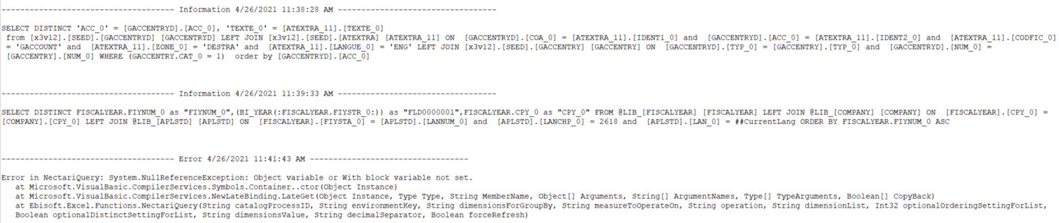 The Excel log on the client machine contains the trace of SQL statements generated by the Excel Add-in itself. It provides warnings and error messages if SQL queries or processes failed.