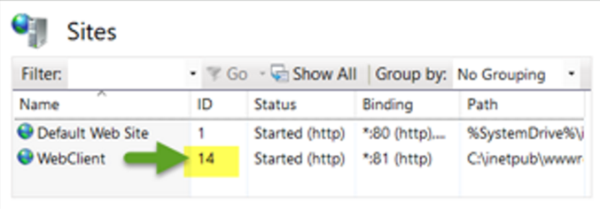 Once in IIS, click Site and look on the right at the ID number. In the example below, the Site ID number is 14.