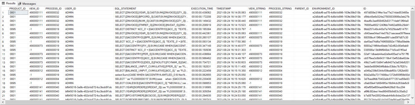 The SQL Execution log provides information related to SQL execution, such as SEI product ID, Data model ID, view ID, User ID, SQL statement, SQL execution time, Timestamp, Environment ID for all SQL queries processed by the BI Service.