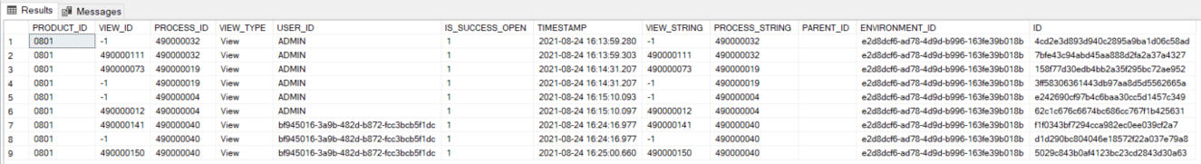 The View Usage log provides information related to the views, such as SEI Product ID, View ID, Data model ID, Successful execution, Timestamp, and Environment ID for all Views processed by the BI Service.