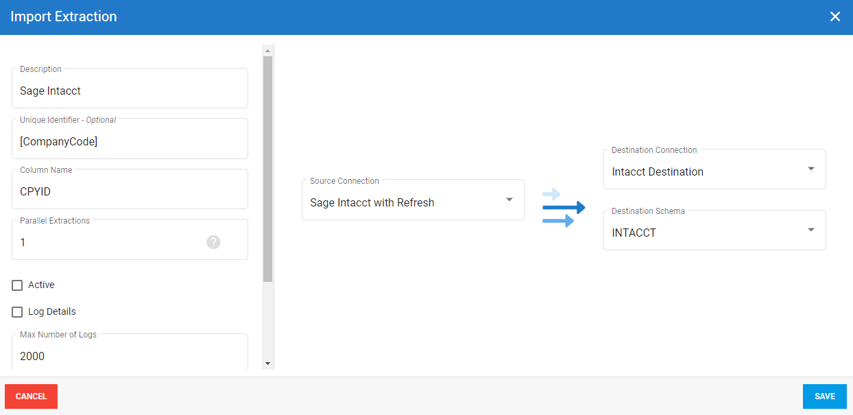 After configuring the source and destination connections, you need to import the Sage Intacct zip templates to create extractions.