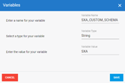 Les utilisateurs de SXA doivent créé une variable globale appelée SXA_CUSTOM_SCHEMA et donner la même valeur au schéma (SXA) spécifié dans leurs extractions. Cela permet aux scripts de post-exécution de lire les tables de l'entrepôt de données et d'insérer les champs manquants là où c'est nécessaire.