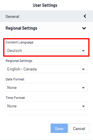 - Retournez à la page d'accueil et changez la langue dans la section Profil utilisateur sous l'onglet Paramètres régionaux pour sélectionner la langue dans laquelle vous venez de saisir une traduction.