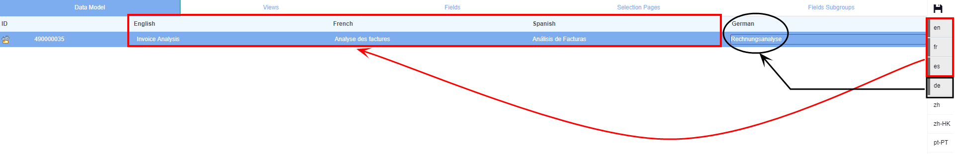Les instructions ci-dessous sont utilisées pour traduire manuellement un modèle de données. La procédure est la même pour les vues, les champs et les pages de sélection.