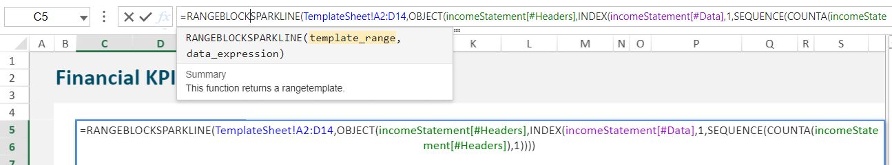 La formule de sparkline de blocs de gamme a la syntaxe suivante : =RANGEBLOCKSPARKLINE(template_range, data_expression) Exemple de formule de sparkline de blocs de gamme avec les fonctions OBJECT, INDEX et SEQUENCE pour créer le sparkline montré à l'étape 5: =RANGEBLOCKSPARKLINE(TemplateSheet!A2:D14,OBJECT(incomeStatement[#Headers],INDEX(incomeStatement[#Data],3,SEQUENCE(COUNTA(incomeStatement[#Headers]),1)))) |