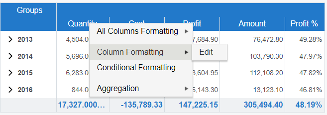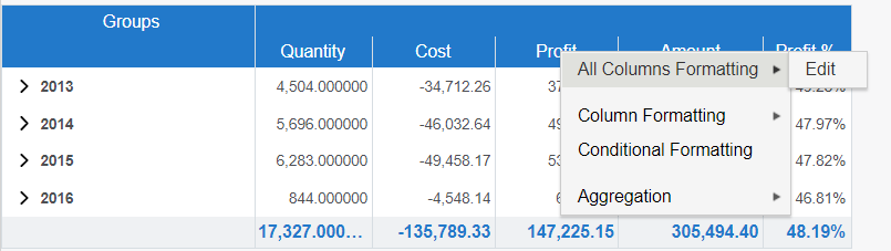 Cliquez sur l'icône Tous les groupes ou Toutes les colonnes à côté de Groupes ou Colonnes et sélectionnez Formatage de colonne > Modifier.