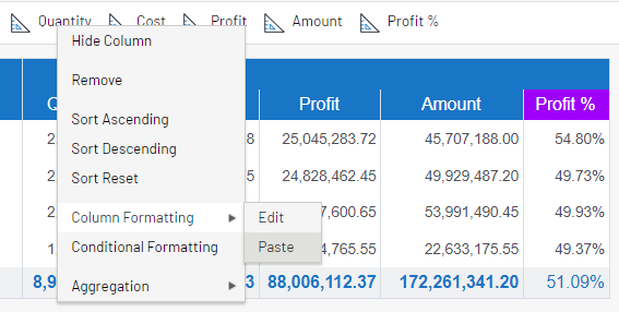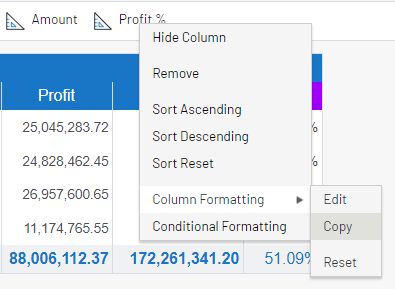 Sélectionnez Formatage de colonne > Copier. Un message s'affiche pour confirmer que les données ont été copiées.