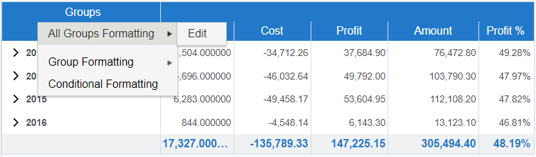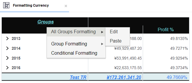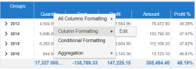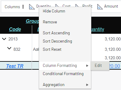 Cliquez sur un champ dans l'en-tête de colonne/groupe et sélectionnez Formatage de colonne > Modifier.