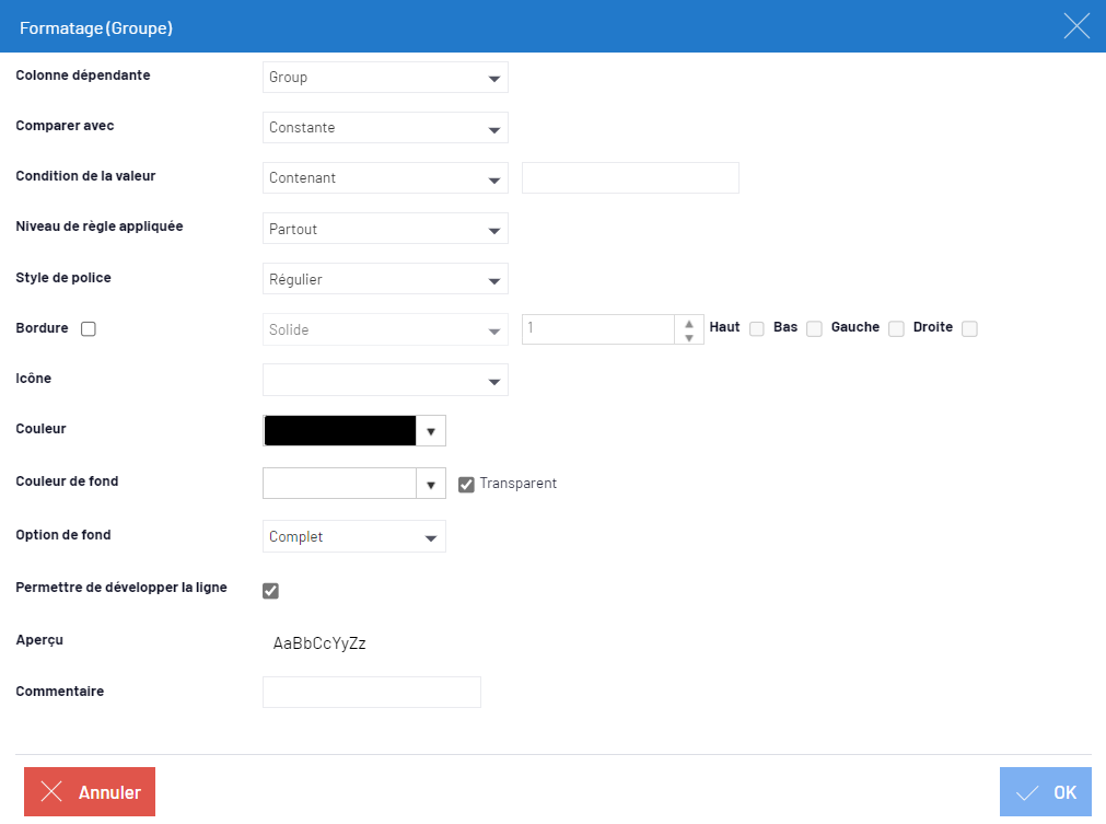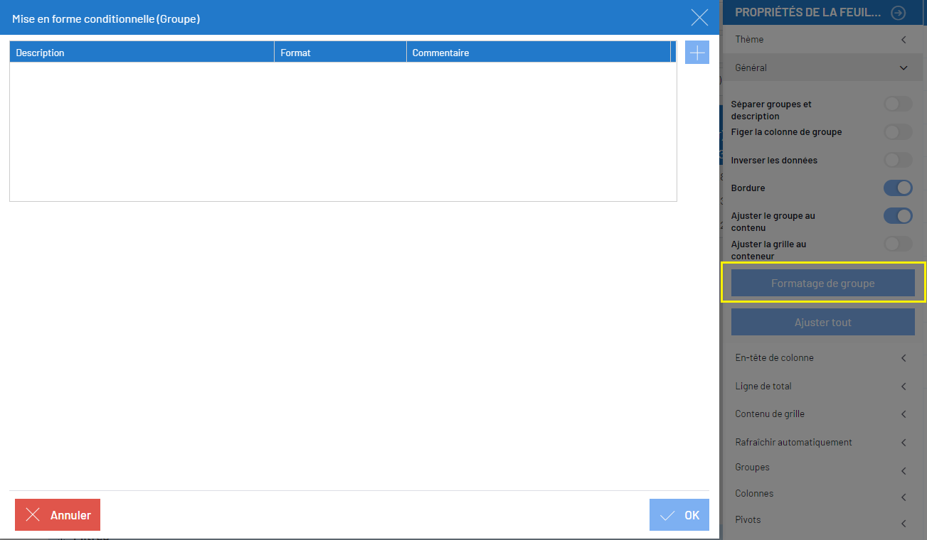 NoteLa fenêtre Mise en forme conditionnelle (Groupe) est similaire à la fenêtre Mise en forme conditionnelle pour les colonnes ; référez-vous à la rubrique Appliquer une mise en forme conditionnelle à une colonne pour plus de détails.