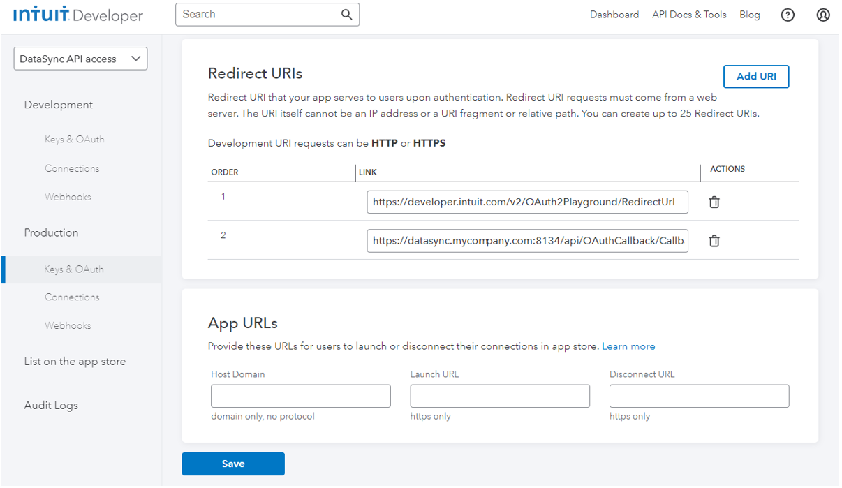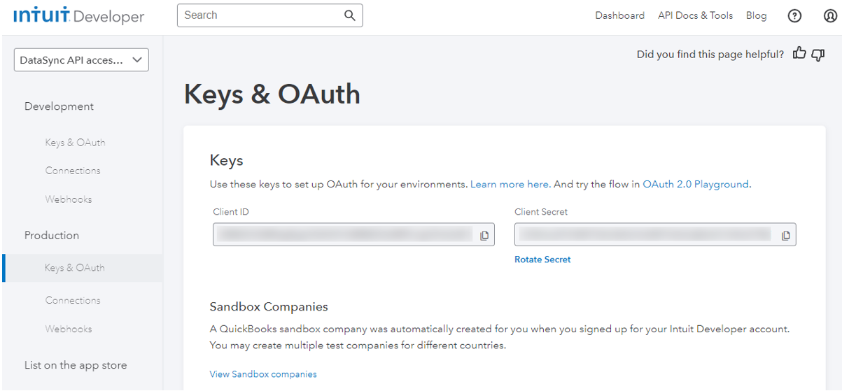 Go back under the Production section on the Intuit Developer Portal: