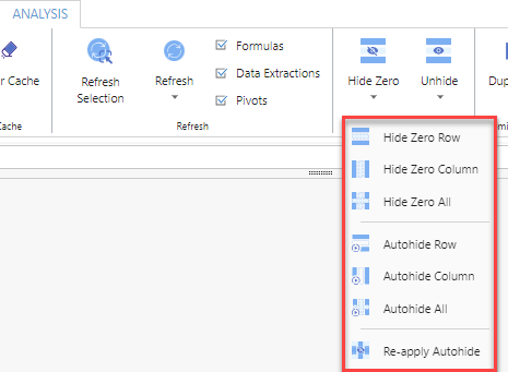 | Autohide All | Automatically hides both rows and columns with zero values after each data refresh. The selected range(s) will be stored within the Name Manager. |