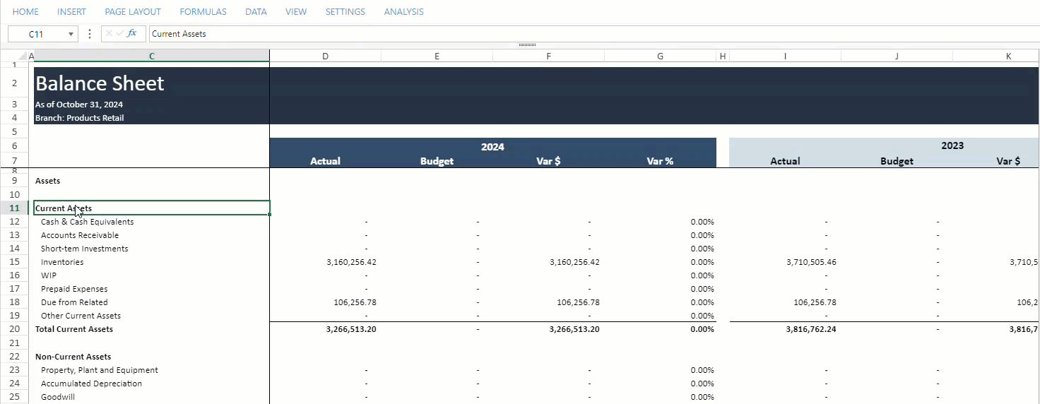 Located within the workbook, the Hide Zero tool allows you to hide rows and columns with cells that contain only zeroes. You can do this by specifying the range of rows and columns to be hidden by selecting the Hide Zero tool. This helps users create cleaner and more readable reports. Users can manually hide zero-filled rows and columns or enable the auto-hide function, which will dynamically hide and unhide rows and columns based on refreshed data. The feature also includes an Unhide button, which lets users temporarily view hidden rows and columns.