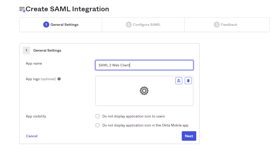 Dans le champ App name, saisissez SAML 2 Web Client.
